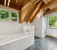 • modern bathroom, white tiles, large bathtub, white sink, mirror, white towels, modern lighting, wooden floor