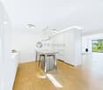 • modern kitchen, marble counter, glass walls, stairs, balcony, large windows