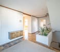 • hallway with beige tiles, wood door, ceiling lamp, wall artwork, glass tiles wall