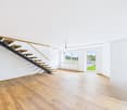 • Modern interior with wooden staircase, wooden flooring, white walls, abstract artwork on wall, small rug at entrance.