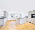 • Minimalist kitchen with white countertops, white wooden stools, wooden floor, and white cabinets