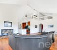 • open living area, modern style, bright windows, wooden tables and chairs, white flooring