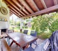 • Patio with seating area, fireplace, dining table with chairs, chimney, covered pergola with plants, small house, storage shed, and chimney