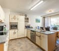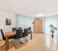 • modern open plan kitchen and dining room, wooden table and chairs, breakfast bar, beige floor, large windows, balcony