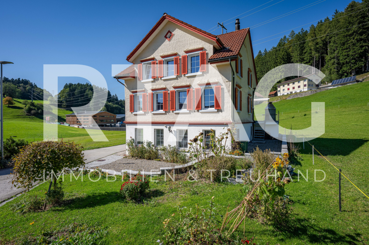 In Rehetobel geniessen Sie das Beste aus zwei Welten: Ruhe, Natur und frische Bergluft ? kombiniert mit guter Erreichbarkeit und einem lebendigen Dorfleben. Ob ein kurzer Spaziergang durch die Wälder oder eine ausgedehnte Wanderung mit Panoramablick ? hier finden Naturfreunde alles, was das Herz begehrt.Dieses charmante Einfamilienhaus überzeugt durch seine einmalige Lage mit traumhafter, unverbaubarer Aussicht auf das Bergpanorama. Umgeben von Grünflächen und Wäldern ist es der ideale Ort, um Energie zu tanken und den Alltag hinter sich zu lassen.Highlights des Einfamilienhauses? Wunderschöne, unverbaubare Panoramasicht über die Bergwelt? Grosszügiges Grundstück? Ruhige, familienfreundliche und sonnige Lage? Individuelle Ausbaumöglichkeiten und flexible GrundrissgestaltungAusstattung und Raumaufteilung?Das Einfamilienhaus erstreckt sich über vier Etagen und bietet grosszügige, vielseitig nutzbare Räume mit viel Potenzial.?Wohn- und Essbereich: Hell und einladend mit gemütlichem Kachelofen und kunstvollen Stuckaturen an den Decken, die dem Haus eine charmante Note verleihen.?Küche: Praktisch ausgestattete Küche mit Gaskochfeld, Backofen und direktem Zugang zum Essbereich ? ideal für gemeinsames Kochen und gesellige Abende.? Schlafräume: Vier Schlafzimmer, darunter ein grosszügiger Masterbedroom und ein Zimmer mit praktischem Reduit. Weitere Räume können individuell als Kinder-, Gäste- oder Arbeitszimmer genutzt werden.? Badezimmer: Zwei gepflegte Badezimmer mit Dusche oder Badewanne bieten Komfort für die ganze Familie.? Nebenräume: Ein Reduit mit Waschmaschine, ein Trocknungsraum, zwei Estriche sowie ein Naturkeller sorgen für reichlich Stauraum.? Aussenbereich: Sonniger Sitzplatz mit Südausrichtung und Blick ins Grüne lädt zum Entspannen ein.? Besonderes Extra: Eine charmante, eingebaute Bar sorgt für gemütliche Stunden in herrlicher Atmosphäre.Lage und UmgebungRehetobel bietet Familien und Paaren eine hohe Lebensqualität. Kindergarten und Primarschule sind bequem zu Fuss erreichbar. Verschiedene Sportanlagen und Freizeitmöglichkeiten bieten Kindern und Erwachsenen gleichermassen Abwechslung und Erholung.Finden Sie mit dieser Gelegenheit Ihren neuen RückzugsortGerne zeigen wir Ihnen dieses besondere Zuhause persönlich ? vereinbaren Sie noch heute einen Besichtigungstermin.Wir freuen uns auf Ihre Kontaktaufnahme.