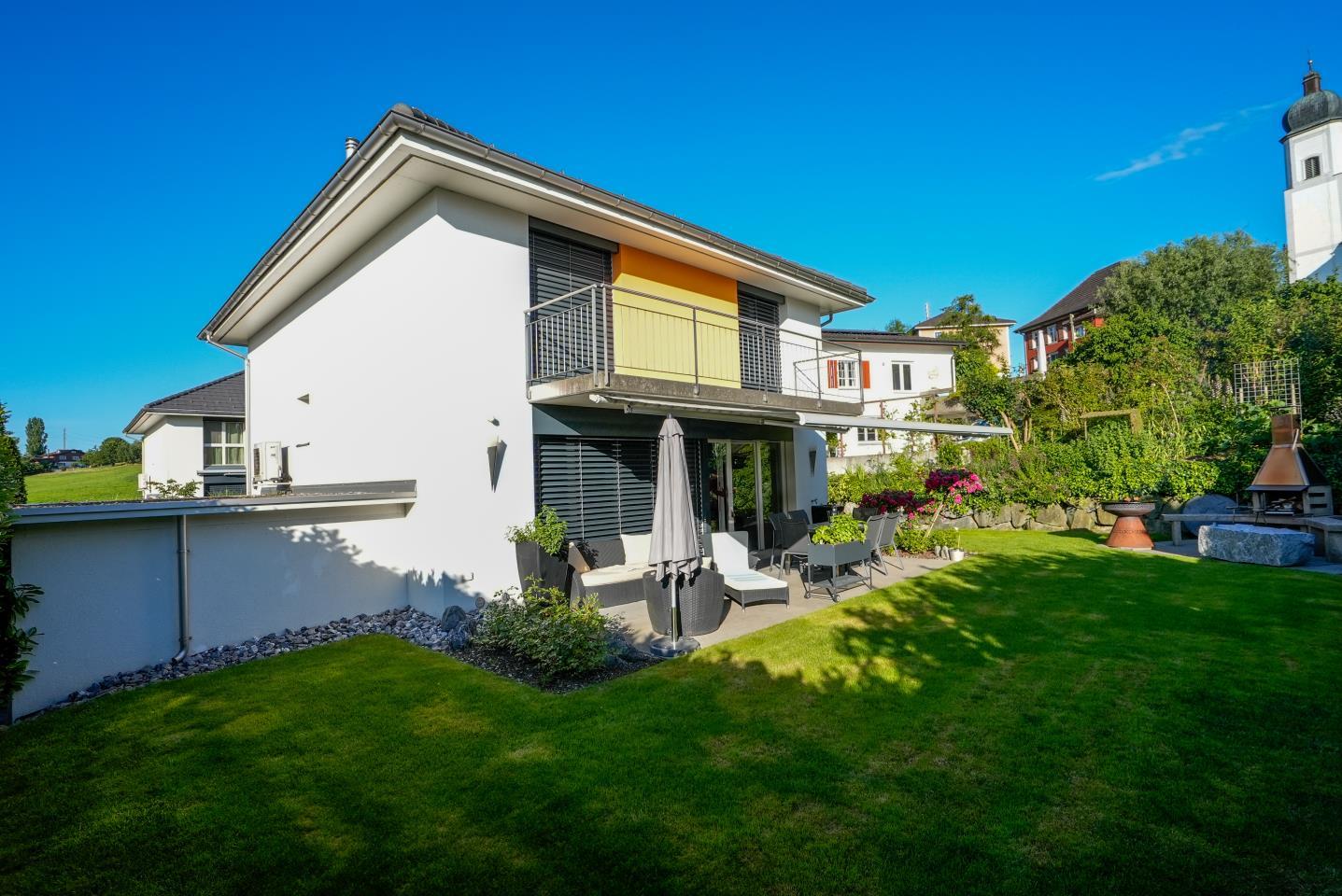 Diese exklusive Exklusive Doppelhaushälfte im Bauhaus Stil überzeugt durch seine herausragende Architektur in bevorzugter Bestlage von St. Gallen (Notkersegg) und besticht durch seine erstklassige Lage und ausgezeichnete Infrastruktur. Die Umgebung bietet ein vielfältiges Freizeit-, Bildungs- und Kulturangebot, das keine Wünsche offen lässt. Das Konzept des offenen Wohnens wurde hier unter Berücksichtigung einzelner Wohnwelten in Perfektion umgesetzt.Das Haus, aktuell in 9.5 Zimmer aufgeteilt, bietet grosszügigen Raum zur flexiblen Nutzung als Wohn- oder Geschäftssitz. Die massgeschneiderten Räume und der hohe Wohnkomfort in Verbindung mit moderner Technik unterstreichen die Exklusivität dieser Immobilie.In der Tiefgarage sind zwei Tiefgaragenplätze und zwei Disponibleräume im Kaufpreis inkludiert und es besteht die Möglichkeit, mehrere Parkplätze und zusätzliche Abstellräume zu erwerben. Der pflegeleichte Aussenbereich, ausgestattet mit einem Rasenroboter, bietet weitere Annehmlichkeiten wie einen Pizzaofen im Garten. Ein Personenaufzug für bis zu 8 Personen und eine einzigartige Wellnessoase mit Schwimmbad, Whirlpool, Klafs Sauna/Sanarium, Kneipp-Tretbecken, Solarium und Küche, sowie zahlreiche technische Highlights runden das umfangreiche Angebot ab. Diese Liegenschaft vereint Luxus, Komfort und Sicherheit an einer der besten Adressen in der Stadt St. Gallen.Besuchen Sie die eigene Webseite dieser Immobilie, http://3d.immoleague.ch/980322und erhalten Sie Zugang zu: virtuelle Besichtigung, ausführliche Dokumentation mit weiteren Bildern, Grundriss, weitere Zahlen, Daten und Fakten etc.+ Begehrtes Einfamilienhaus in Stadtnähe (Quartier Notkersegg)+ Zentrale Lage im Grünen (Naherholungsgebiet)+ Gepflegt mit hochwertige Materialien+ Direkter Zugang zum Lift (jedes Stockwerk)+ Erlebnisreiches Wohnkonzept+ Massgeschneiderte Räume mit Komfort+ Eigener exklusiver Wellnessbereich mit allen Annehmlichkeiten: Pool mit Gegenstromanlage & Wasserfall, Whirlpool & Sauna, Springbrunnen und besonderem Ambiente+ Einbauküche mit Partybar im Wellnessbereich+ Integrierte Lichtspots mit Bewegungsmelder+ Hochwertige Küche mit Edelstahlabdeckung und Fronten in Hochglanzschwarz+ Gemütliches Gas-Cheminée im Wohnbereich+ Praktische Einbauschränke & Garderobe+ Schlafzimmer mit grosser Ankleide+ Drei hochwertige Badezimmer (Masterbad mit Dampfdusche)/ Badezimmer mit Closomat+ Grosszügige Terrasse mit Garten+ Multimediasteuerung zentralisiert+ Separater Waschraum mit WM/TM+ Zentralstaubsauger + Elektrische Lamellen-Raffstoren mit Zentralsteuerung+ Grosser, pflegeleichter Aussenbereich mit Rasenroboter+ Pizzaofen und Grillbereich im Garten+ Hohe Decken, bis zu 3.50 mNutzen Sie diese einmalige Gelegenheit im Quartier Notkersegg.Wenn Sie weitere Informationen für Ihre Entscheidungsgrundlage benötigen, sind wir gerne für Sie da.Sie sind an dieser einmaligen Gelegenheit interessiert und wünschen weitere Informationen für Ihre Entscheidungsgrundlage? Dann melden Sie sich gerne bei uns. Wir sind für Sie da. Ihr ImmoLeague TeamSie kennen jemanden, der sich für diese Immobilie interessieren könnte oder benötigen selbst Unterstützung beim Verkauf Ihrer Immobilie?Als zertifizierte und mehrfach ausgezeichnete ImmobilienExperten stehen wir Ihnen mit unserem leistungsstarken Angebot für Ihre Fragen und Anliegen gerne zur Seite. This exclusive semi-detached house in Bauhaus style impresses with its outstanding architecture in a prime location in St. Gallen (Notkersegg) and boasts a first-class location and excellent infrastructure. The surrounding area offers a wide range of leisure, educational and cultural activities that leave nothing to be desired. The concept of open-plan living has been implemented to perfection here, taking into account individual living environments.The house, currently divided into 9.5 rooms, offers generous space for flexible use as a home or business premises. The tailor-made...