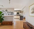• Open floor plan, tile flooring, kitchen with counter, integrated stove and oven, sink, modern design