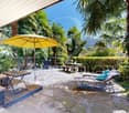• Outdoor dining area with table and chairs, sliding glass doors, gravel floor, plants, and a glass roof.