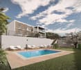• Modern architecture, many glass windows, raised ground floor, terrace