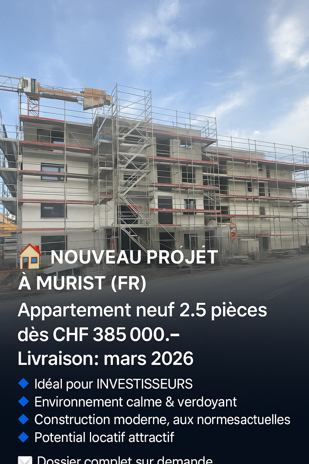 ***VENDU*** À vendre : magnifique appartement neuf de 1.5 pièces au 1er étage dans un immeuble moderne avec ascenseur.Situé au cœur de la Broye, dans la charmante commune de Lully à deux pas d’Estavayer-le-Lac, le « Hameau de la Fontaine » offre un cadre de vie moderne à proximité des commodités, des transports et du lac de Neuchâtel.Caractéristiques de cet appartement : • Appartement de 1.5 pièces de 58 m2 habitables • Terrasse de 8 m2 • Cuisine ouverte entièrement équipée • Belle chambre et salle de bain avec espace pour les colonnes de lavage • Armoires de rangement à l'entrée de l'appartement • Matériaux et équipements de qualité (pompe à chaleur, panneaux photovoltaïques, triple vitrage, thermostats individuels, etc.) • Parking souterrain, cave privative et local à vélos La livraison est prévue pour le printemps 2027 et toutes les finitions sont aux choix des acquéreurs. Bénéficiez également d’une réduction d’une partie des droits de mutation en cas de 1er achat.N'attendez-plus, contactez-nous pour une visite au 026 663 1470 ou par email : ventes@lombard-immobilier.ch-----------------------------------------------------------Lully se trouve à moins de 5 minutes en voiture de la ville d'Estavayer-le-lac, où vous y trouverez écoles, cycle d'orientation, commerces et transports public. De plus, un arrêt de bus relie le village à Estavayer-le-Lac et l'entrée de l'autoroute se trouve également à 5 minutes en voiture.La commune d'Estavayer, située au bord du lac de Neuchâtel, est une commune fribourgeoise de 10'000 habitants et le chef-lieu du district de la Broye.Le centre-ville historique d'Estavayer-le-Lac renferme des trésors d'architecture, notamment le château de Chenaux et la Collégiale Saint-Laurent datant du Moyen Age. Prisée à la belle saison par les voyageurs, cette ville est reconnue pour son magnifique bord de lac et son atmosphère détendue.Elle propose de nombreuses activités lacustres (voile, kitesurf, paddleboard, wakeboard, etc.) grâce à son port de plaisance et à son centre de sports nautiques, le mieux équipé de Suisse.Elle propose également des balades à vélo sur plusieurs kilomètres en pleine nature dans la réserve de la Grande Cariçaie et de nombreuses animations telles que le festival « Estivale Open Air », le théâtre l'Azimut et bien d'autres.La ville est bien desservie grâce à l'autoroute A1 (entrée à 5 minutes), une gare CFF et une gare routière. Elle est stratégiquement située entre Lausanne (40 min) et Berne (35 min).