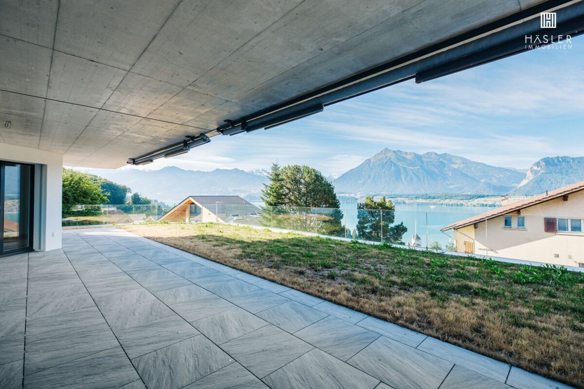 Weitere Informationen finden Sie auf unserer Website www.haeslerimmobilien.chAn ruhiger, erhöhter Lage in Oberhofen am Thunersee steht diese hochwertige 1½-Zimmer-Neubauwohnung mit traumhafter, unverbaubarer Aussicht auf See und Berge zum Verkauf. Die im Jahr 2023 fertiggestellte Neubauwohnung bietet 111 Quadratmeter Wohnfläche sowie einen 190 Quadratmeter grossen, pflegeleichten Garten mit gedecktem Sitzplatz, ideal für Familien oder Paare, die viel Platz und Privatsphäre schätzen.Der lichtdurchflutete Wohn- und Essbereich mit bodentiefen Fenstern, die moderne Küche mit Kochinsel, zwei stilvolle Badezimmer und drei vielseitig nutzbare Räume sorgen für Wohnkomfort auf hohem Niveau. Der Innenausbau kann bei den Badezimmern noch individuell mitgestaltet werden.Die erhöhte, ruhige Lage oberhalb des Dorfkerns, direkt am Landschaftsschongebiet, garantiert Erholung und eine unverbaubare Panoramasicht auf den Thunersee und die Alpen. Ein besonderes Plus ist der direkt angrenzende Keller auf derselben Etage, praktisch für zusätzlichen Stauraum. Die Kühlung über die Bodenheizung sorgt auch im Sommer für ein angenehmes Raumklima. Ein hindernisfreier Zugang per Lift sowie zwei optional erhältliche Einstellhallenplätze runden dieses attraktive Angebot ab.Miet- / Kaufoption möglich.Überzeugen Sie sich selbst von dieser einzigartigen Wohngelegenheit in Oberhofen am Thunersee und vereinbaren Sie einen Besichtigungstermin mit uns. Wir freuen uns auf Ihre Kontaktaufnahme.