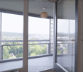• Modern apartment with large glass windows, open kitchen, dining area, and a spacious balcony or terrace overlooking a scenic outdoor landscape.