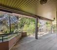 • modern balcony with wicker couches, table, white flowers, view of the city, large windows
