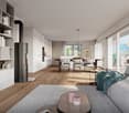• modern design, dining area with dining table and chairs, living area with sofa, coffee table, and wooden floor, kitchen with white cabinets, and large windows