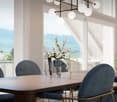 • dining table, blue chairs, large windows, balcony, fireplace, paintings, gray sofa, coffee table