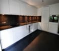 • Modern kitchen with white cabinets, black countertop, built-in oven, and dishwasher. Exposed wooden beams on the ceiling add a rustic touch.