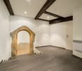 • Empty room with hardwood floors, white walls, wooden door, power outlet