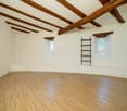 • empty room, white walls, wooden floor, window with blinds, power outlet, radiator