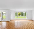 • Sliding glass doors leading to balcony, large windows, city view, beige flooring