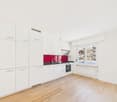 • Open-plan kitchen, modern design, hardwood floors, built-in cabinets, stainless steel appliances, sink, faucet, large window, two doors leading to other rooms