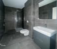 • Modern bathroom with grey tiles, single sink with wooden cabinet, wall-mounted toilet, power outlet, open door