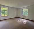 • Spacious and minimalist room with white walls, large windows, and hardwood flooring in a herringbone pattern. The room features a sliding door and additional windows, providing ample natural light.