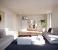 • Spacious open-plan living area with hardwood flooring, large windows, and access to a balcony or terrace. The room has a clean, minimalist design with white walls and built-in storage units.