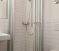 • Tiled floor and walls, walk-in shower, glass shower enclosure, sink with cabinet, mirror