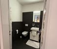 • Bathroom with sink, toilet, and a large mirror.