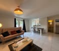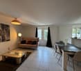 • Open-plan living and dining area with dining table, sofa, chairs, open kitchen, hallway leading to bedrooms.