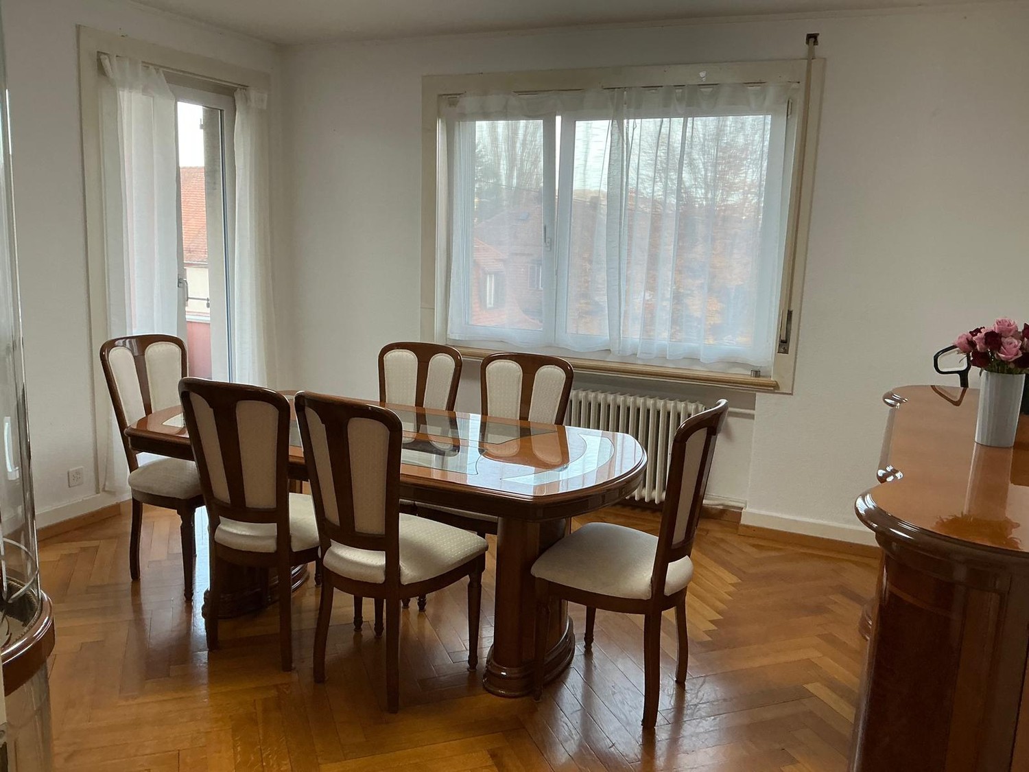 • wooden cabinet with drawers, white wall, vase with flower, window with balcony railing