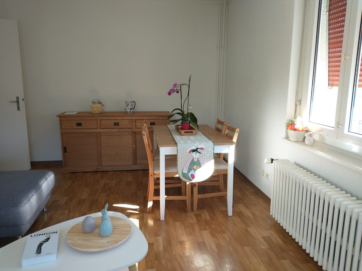 • Dining table with chairs, decorative items, carpet, pink and white wall, wooden floor