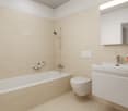 • white tiles, white sink, white toilet, shower curtain, radiator, mirror, illuminated mirror above sink