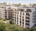 • Large multi-story apartment building with balconies, large grassy lawn, several trees, other buildings visible in the background