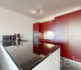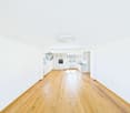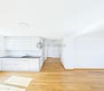 • modern kitchen, wooden floor, white walls, modern cabinetry, integrated oven, range hood, sliding doors leading to balcony, open space design