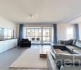 • Spacious open-concept living room with large sectional sofa, wooden coffee table, and modern pendant lighting. The kitchen is visible in the background with sleek gray cabinets and appliances. Large windows provide natural light and access to a balcony or