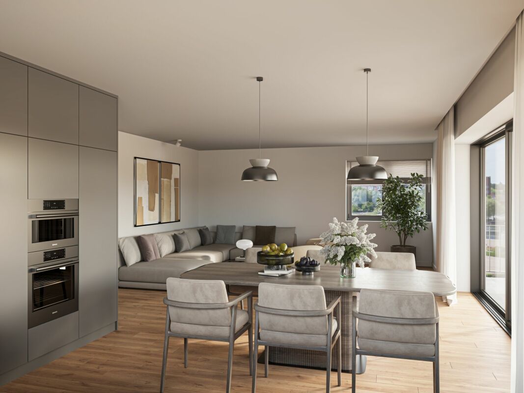 • Spacious open-concept living room with large sectional sofa, wooden coffee table, and modern pendant lighting. The kitchen is visible in the background with sleek gray cabinets and appliances. Large windows provide natural light and access to a balcony or