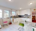• modern open kitchen, round dining table, white kitchen cabinets, round ceiling light, large window, dishwasher