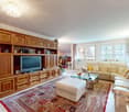 • large couch, beige rug, glass doors leading to balcony, table, lamp, pictures