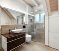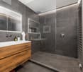 • Bathroom: rectangular white sink, dark wooden cabinet, round illuminated mirror, walk-in shower, faucets