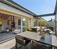 • outdoor seating area, glass railing, lake view, wooden table, bottles of wine, chairs, cushions, lanterns, round table