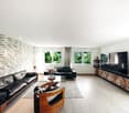• Glass doors to terrace, wooden flooring, two couches, coffee table, fireplace, rug, lamps, potted plants, rug by table