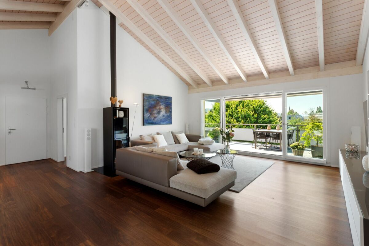 Diese Dachwohnung bietet ein Wohnambiente, das man nicht einfach besichtigt - man spürt es vom ersten Moment an. Die Räume sind grosszügig gestaltet, die Deckenhöhe schafft ein Gefühl von Freiheit, und das viele Tageslicht verleiht der Wohnung eine warme und einladende Atmosphäre.Die stilvolle Renovation verbindet modernes Design mit hoher Wohnqualität. Küche, Bad und Böden wurden mit viel Liebe zum Detail erneuert - alles ist bereit für Menschen, die ein schönes, gepflegtes Zuhause suchen, das sofort bezugsbereit ist.Folgende Highlights bietet Ihnen diese Liegenschaft: • Strahlend weisse und hohe Decken verleihen ein wunderschönes Loft-Feeling • Grosszügiger und praktischer Grundriss vereint Wohnen, Schlafen und Arbeiten optimal • Komplett renovierte Küche mit hochwertigen Geräten • Bad mit Walk-in Dusche • Zweites Badezimmer mit Badewanne & Fenster • Reduit mit WM / Trockner in der Wohnung • Neuer Eichenparkett in warmen, stilvollen Ton, der ein harmonisches Raumgefühl schafft • Offener Wohn- und Essbereich mit viel Tageslicht und Zugang zu einer gemütlichen Loggia • Charmante Dachschrägen und Sichtbalken sorgen für Wohncharakter mit besonderer Atmosphäre • Drei grosszügig geschnittene Zimmer • Grosser allgemeiner Abstellplatz in der TG für Velo, Vespa & Kinderwagen • Eigenes Kellerabteil • 1 x Tiefgaragenplatz CHF 30'000.- exkl. • Aussenparkplatz kann für CHF 10.-/mtl. dazu gemietet werden Ein Zuhause, das nicht nur überzeugt - sondern berührt.Haben wir Ihr Interesse geweckt? Dann kontaktieren Sie uns noch heute für einen Besichtigungstermin und lassen Sie sich von dieser aussergewöhnlichen Immobilie überzeugen!