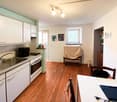 • wood cabinets, white walls, tiled floor, radiator, large window, kitchen table, kitchen stove, dishwasher, washing machine