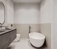 • Compact bathroom, white ceramic tiles, sink, toilet, mirror, white fixtures, wall-mounted tissue holder, small footprint