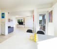 • modern white kitchen, integrated appliances, island countertop, open-plan living area