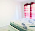 • double bed, white walls, wooden floor, ceiling light, bedside table with lamp, artwork on wall, sliding wardrobes