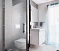 • white tiled walls, black showerhead, white toilet, wooden shower mat, wall-mounted towel rack, white sink