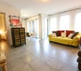 • Contemporary living area with large glass doors, tiled floor, wooden bench, dining table with chairs, couch, balcony, kitchen, dining area, decorative plants