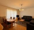 • modern style, glass sliding door, wooden floor, grey sofa, central heating, table and chairs, tv on a white sideboard, carpet, large windows with view
